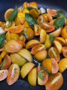 Nel frattempo ripassare i pomodorini datterini in un’altra padella con aglio e olio