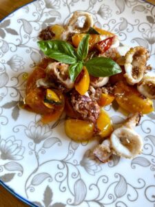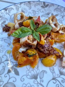 Impiattiamo utilizzando i pomodorini scottati come base, aggiungiamo i calamaretti croccanti, basilico e peperoncino fresco.