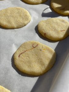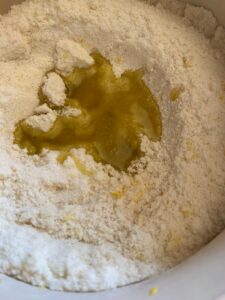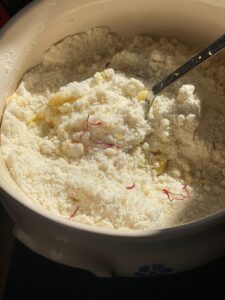 Setacciare e mescolare le farine, aggiungere la scorza di limone grattugiata e poi, poco alla volta, aggiungere l’acqua e l’olio. Successivamente aggiungere i pistilli di zafferano (o se non li trovate anche lo zafferano in bustina va bene) e mescolare fino ad avere una consistenza pastosa e omogenea.