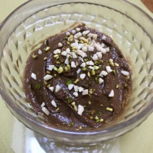 La prepariamo con 250 grammi di polpa di avocado ben maturo, 70 grammi di cioccolato fondente (85% minimo), 1 cucchiaio di cacao amaro in polvere. Per dolcificare, versione super light con eritritolo (un cucchiaio) oppure zucchero di canna. Per guarnire granella di mandorle e pistacchi.