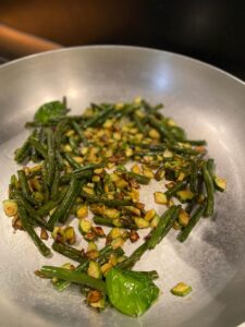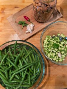 Per la preparazione iniziamo dalle verdure. Puliamo i fagiolini privandoli delle due estremità e lasciamoli in ammollo in acqua fredda, per farli risultare più croccanti, poi facciamoli bollire per 3/5 min e infine freddiamoli in acqua fredda per interrompere il processo di cottura e preservarne le proprietà.