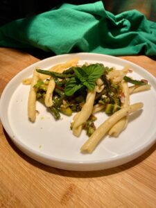 Scoliamo la pasta al dente e ripassiamo in padella con le verdure aggiungendo a cottura ultimata spezie, pinoli o mandorle e scorza di limone per conferire una nota fresca al piatto.