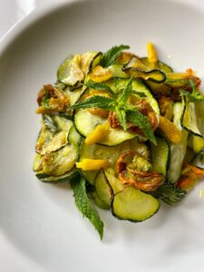 Tagliate a rondelle sottili le zucchine (e se volete anche i fiori), poi friggetele in olio evo per qualche minuto. Dopo averle scolate su carta paglia, condite con aceto di vino rosso a piacere e foglie di menta fresca