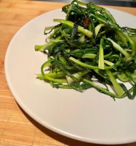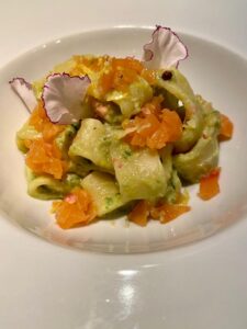 L’alto potere saziante dell’avocado e del salmone giocheranno un ruolo funzionale nel pasto serale equilibrando il carico glicemico e fornendo il giusto apporto nutrizionale anche a seguito di un’attività sportiva intensa. Abbiamo pensato in associazione alla calamarata di avocado un piatto di cicoria ripassata, stimolando il drenaggio epatico e renale.