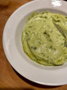 – Nel frullatore unite la polpa dell’avocado, qualche foglia di basilico, aglio (facoltativo), limone e mixate per 2 – 3 min aggiungendo l’olio evo a filo