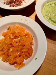 – In parallelo marinate il salmone con olio limone pepe rosa maggiorana/timo al limone