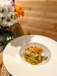 – Aggiungere a fuoco spento (cosi da preservarne le proprietà) la crema di avocado e qualche cubetto di avocado, mantecate e lasciate riposare