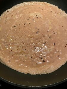 – cuocere la crepes spargendola uniformemente sulla padella. Cuocere la crepes 5 min per il primo lato e 1/2 min una volta girata