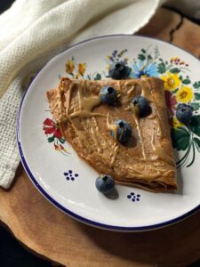 Aggiungiamo a queste crêpes proteiche anche una manciata di mirtilli, frutti di bosco con ottime proprietà sia per la circolazione, come antiossidanti e con effetto ipoglicemizzante