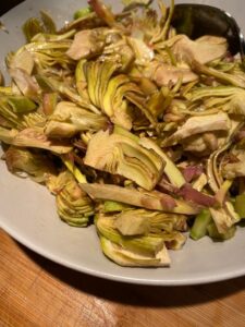 In una ciotolina riponete i totani cotti e trifolate nella stessa padella i carciofi (a piacere aggiungete qualche fogliolina di menta).