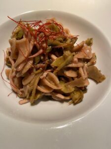 In parallelo tagliare i totani (meglio se piccoli) a julienne e lasciare marinare con foglioline di prezzemolo, scorza di limone ed olio evo.