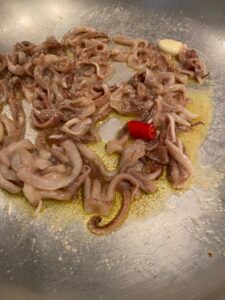 In padella di alluminio scaldare olio aglio gambi di prezzemolo e peperoncino a fuoco basso per aromatizzare l’olio, successivamente aggiungete i totani precedentemente marinati, senza aggiungere sale, e lasciate cuocere a fuoco medio basso con coperchio per 10/15 minuti.