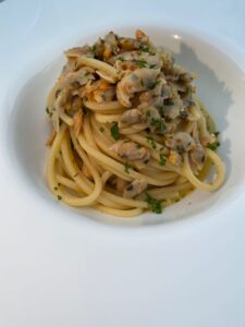 Nel frattempo lessiamo la pasta molto al dente. Scoliamola e terminiamo la cottura in padella con il sughetto delle vongole fino ad assorbimento, uniamo solo alla fine le vongole precedentemente cotte.