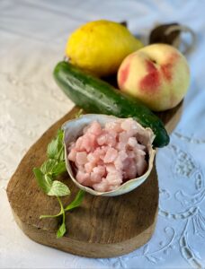 Ve lo proponiamo sotto forma di tartare, ma la funzione del piatto si mantiene anche con il pesce cotto (a scelta tra le cotture funzionali: in padella, al cartoccio o al sale) accompagnato da cetriolo condito con olio evo e da una pesca bianca. Come sempre le nostre sono proposte di presentazione elaborate per essere belle oltre che buone, ma per l’alimentazione quotidiana l’importante è mantenere l’abbinamento tra gli alimenti.