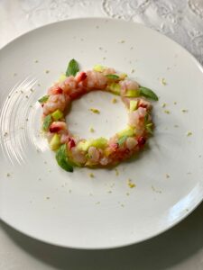 Sfilettare la ricciola e ridurla in tartare al coltello. Condire con olio evo e una spolverata di scorza di limone bio fresco, a parte tagliare cetriolo e pesca bianca a dadini. Impiattare con un coppapasta secondo la propria fantasia, aggiungendo foglie di menta fresca e anche una grattugiata di limone per completare.